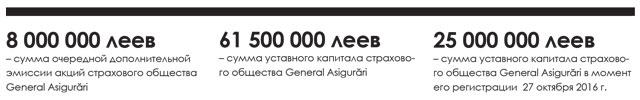 Мажоритарный учредитель General Asigurari Виталий Бодя, владеющий в ее капитале 98% акций, в очередной раз повысил ее уставный капитал, который после регистрации регулятором дополнительной эмиссии составит 61,5 млн. леев. Срочное увеличение капитала страховому обществу понадобилось для поддержания нормального уровня его ликвидности. Профессиональные участники рынка обращают внимание на то, что к капитализации собственник General Asigurari прибегает уже в третий раз, поскольку попадает в поле зрения регулятора, который «берет ее на специальный контроль».