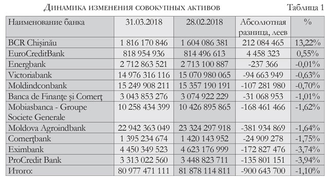Тем не менее справедливости ради следует отметить, что в целом за 1 квартал 2018 г. общий объем совокупных активов вырос на 1,8 %, или 1435,7 млн. леев.