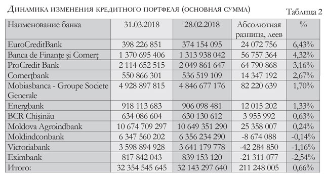 Рост активов в марте зафиксирован лишь у двух банков - BCR Chişinău (+13,2%, или 212,1 млн. леев) и EuroCreditBank (+0,6%, или 4,5 млн. леев). Все остальные девять банков показали снижение активов. Наибольшее абсолютное снижение произошло у Moldova Agroindbank (-1,6%, или минус 381,9 млн. леев), а наибольшее относительное – у ProCredit Bank (-3,9%, или минус 135,8 млн. леев).