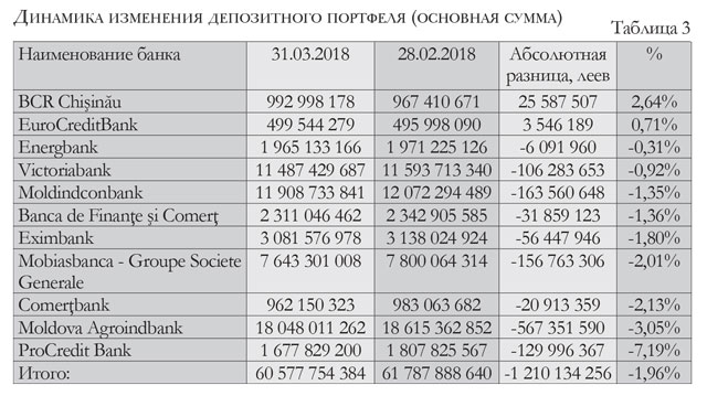 В то время как росли кредиты депозитный портфель в марте неожиданно снизился почти на 2%, или 1210,1 млн. леев. Сжатие портфеля связано преимущественно с оттоком средств с текущих счетов юридических лиц на 808,2 млн. леев, а также выводом средств со срочных процентных депозитов: юридических лиц - на 373,7 млн. леев и физических лиц - на 283,3 млн. леев (суммы включают в себя отрицательную курсовую разницу по евро и доллару).
