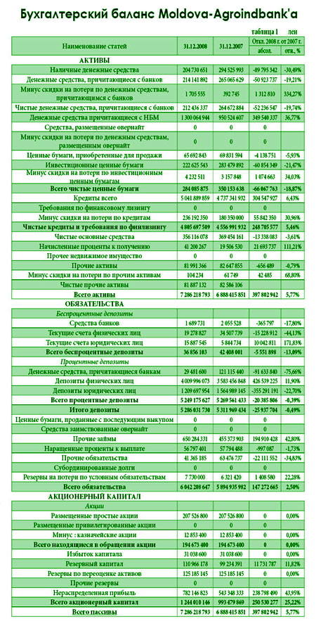 Активы банка выросли с 6,89 млрд. леев до 7,29 млрд. леев, или на 5,77%. Акционерный капитал (чистые активы) вырос на 25,22%, и по состоянию на 31 декабря 2008 г. составил 1,24 млрд. леев. Величина чистых активов на 1 акцию увеличилась на 257,39 леев - с 1,02 до 1,28 тыс. леев. Показатели рентабельности активов ROA и рентабельности капитала ROE составили 4,04% и 25,62%, соответственно, против 4,08% и 27,97% в конце 2007 г.