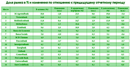 Картина прироста показателей за четвертый квартал подтверждает предположения из предыдущего анализа, в котором говорилось о болевых точках крупных банков. Именно на них, как на основных игроков, легло бремя оттока привлеченного капитала. В их число попали: Moldova-Agroindbank (депозитный портфель уменьшился на 10,5%), Moldindconbank (-7,2), Banca Socială (-6,6), Banca de Economi (-2,3) и Mobiasbanca (-1,7). Создается впечатление, что новый менеджмент Mobiasbanca в четвертом квартале стал излишне осторожничать, замедлив развитие, продолжавшееся с появлением французского акционера в банке. В доказательство сказанного можно привести деятельность его основного соперника – Eximbank-а, который, растолкав окружающих локтями, просто ворвался в пятерку сильнейших.