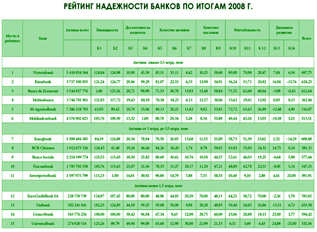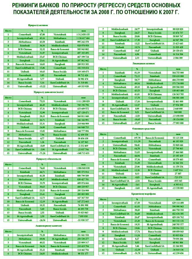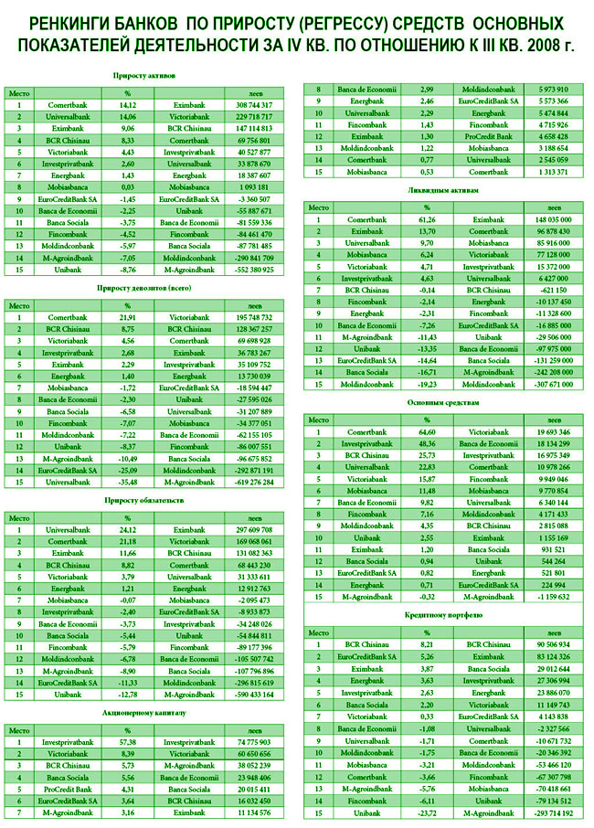 Новым менеджерам Moldindconbank и Comertbank не повезло. Им приходится делать первые шаги и проявлять свои качества в трудные времена. Правда, менеджер Comertbank-а просто не успевает реагировать на окружающее, так как весь конец года она была занята переездом в новый офис банка. Несмотря на это успехи у банка очевидны – активы выросли почти на 50%, депозитный портфель - на 75%, ликвидные активы - на 81%(!). В большей части эти заслуги стали возможны благодаря помощи акционеров, увеличивших капитал на 75,2%. Именно из-за чрезмерно завышенных показателей банк не только не поднялся в рейтинге, но опустился на предпоследнюю позицию, так как очевидно, что в дальнейшем такой уровень будет сложно поддерживать. Напомним, что рейтинг основан на отношении показателей к расчетному идеальному для молдавского рынка учреждению.