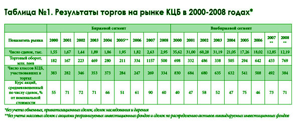 Статистические итоги торгов на биржевом и внебиржевом рынках КЦБ на протяжении 2000-2008 гг. представлены в таблице 1. Следуя ранее избранному подходу, из рассмотрения исключены операции, коммерческий характер которых неоднозначен. Речь идет о сделках дарения, наследования, приватизации и обмена (*).