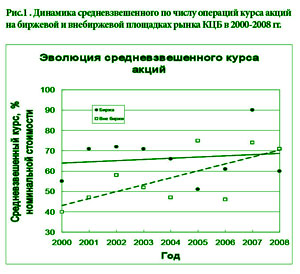 Анализ статистики биржевых и внебиржевых торгов на рынке КЦБ в 2000-2007 гг. обозначил весьма обнадеживающие статистические тенденции развития рынка. Если говорить о среднесрочной динамике, то в 2007 г. средневзвешенный курс акций на биржевой площадке вырос с 61 до 90% их номинальной стоимости, а на внебиржевой – с 46 до 74%.