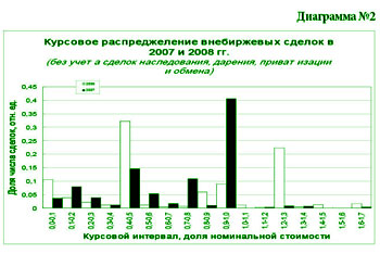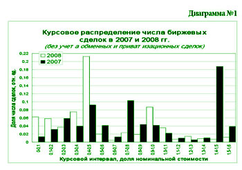 Сопоставление диаграмм №1 и №2 позволяет судить как об общих тенденциях, так и об особенностях развития ценовой ситуации в биржевом и внебиржевом сегментах в 2008 г. Общим для обоих сегментов рынка КЦБ является повышение актуальности в торговой статистике сделок, приходящихся на интервалы «низких» и «средних» курсов, и ослабление статистического вклада интервалов «высоких» и «сверхвысоких» курсов. Однако если для биржевого сегмента интересы инвесторов в интервале «сверхвысоких» курсов стали слабеть, то во внебиржевом сегменте эти интересы заметно усилились.