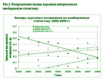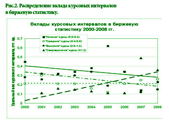 Распределение вкладов отдельных курсовых интервалов в биржевую статистику 2000-2008 гг. иллюстрирует рис.2.