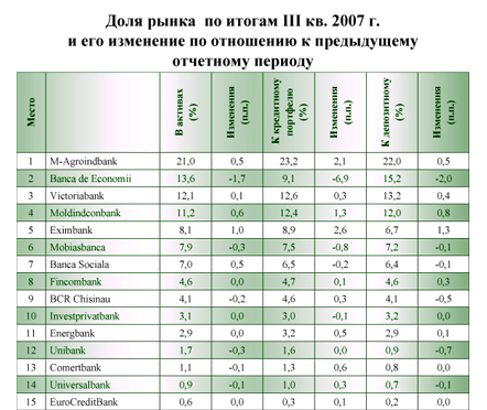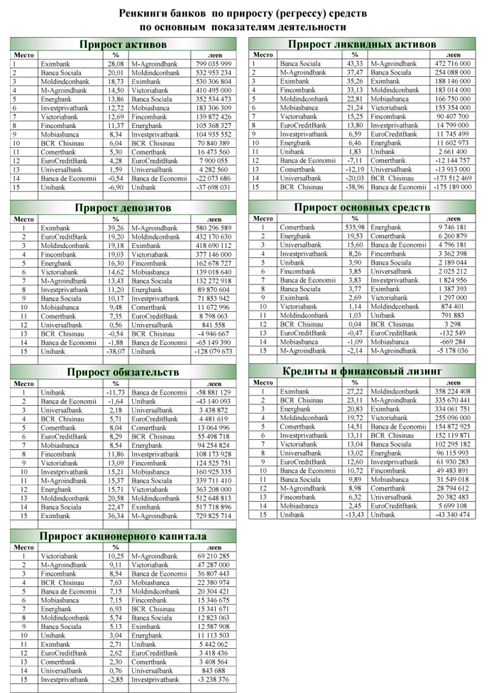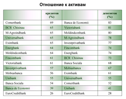 За последние три месяца больше всех кредиты выдали: Moldindconbank (358,22 млн. леев), M-Agroindbank (335,67 млн.) и, что некоторым покажется удивительным, - Eximbank (334,06 млн.). Последний лидирует и по относительному приросту кредитного портфеля - 27%. За ним следует – BCR Chişinau (+23%) и Energbank (21%). Unibank оказался единственным по системе, задекларировавшим снижение этого показателя (-43,3 млн. леев). Наиболее вероятная причина – подготовка банка к передаче другому собственнику, которым, после нескольких тендеров, стала австрийская копания Viena Capital Partners. Удивительно то, что банк не только не выдавал деньги, но и, похоже, не принимал - снижение по депозитному портфелю составило 128,08 млн. леев (-38,1%), хотя не исключено, что крупные клиенты, услышав о смене владельца, предпочли поменять банк. В результате активы Unibank снизились на 6,9% – до 508,88 млн. леев, но, с точки зрения надежности и возможности возврата средств клиентам, показатели банка оказались хорошо сбалансированы.