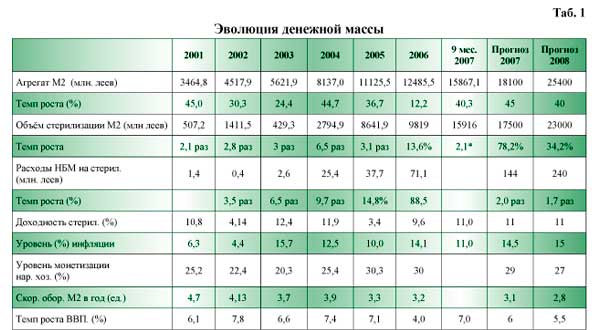 В IV квартале 2007 г. скорее всего восстановится в существенных объёмах процесс экспорта алкогольной продукции в Россию. Темпы роста трансфертов эмигрантов вряд ли уменьшатся значительно. Продолжится приватизация объектов госсобственности и покупка нерезидентами крупных, дорогостоящих пакетов акций банков. В парламент уже направлен проект закона о новом увеличении требований к нормативному капиталу банков. Внешние заимствования значительно увеличиваются за счет займов предприятий с иностранным капиталом у своих зарубежных материнских компаний. Другими словами, тенденция к росту денежной массы не изменится, будет по-прежнему опережать темпы роста ВВП. И, к сожалению, по-прежнему не будет соблюдаться тем самым «золотое правило» монетаризма о соответствии темпов роста ВВП темпам роста денежной массы. Ситуация будет сравнима с 2004 г., что видно из таблицы 1. Поэтому рост денежной массы по итогам 2007 г. составит не меньше 45%, а в абсолютном выражении – не меньше, чем до 18,1 млрд. леев.