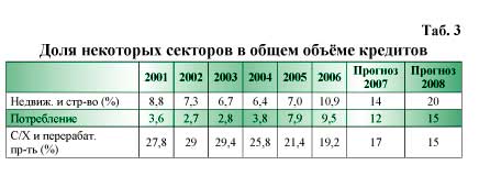 Увеличение доходности депозитов и удорожание в 2008 г. кредитов увеличит соблазн их невозврата, поэтому доля скомпрометированных кредитов может возрасти. Далее банки, в условиях уже длительного отсутствия де-факто Бюро кредитных историй, вынуждены будут ужесточить процедуру оформления залога и кредитования. Таким образом, доступность заемных средств еще более уменьшится, что дополнительно осложнит условия расширенного воспроизводства товаров. Отраслевая структура кредитов ухудшится, соотношение между темпами роста обязательств банков по обслуживанию депозитов и темпами роста доходов от кредитов по-прежнему позволит говорить о наличии признаков «перегрева» банковской системы.
