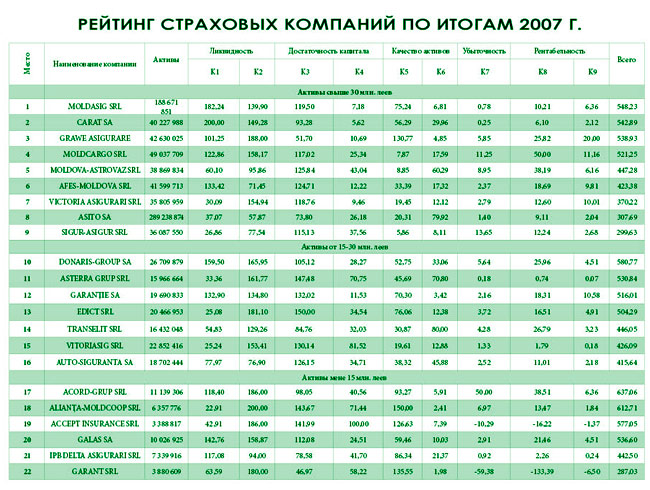 Обращает на себя внимание тот факт, что чистые активы компаний росли большими (+23,1%) темпами, чем совокупные. Если в 2006 г. они составляли 296,44 млн., то в 2007 г. уже 364,88 млн. леев, что, по мнению независимых экспертов, «является хорошим качественным изменением».]