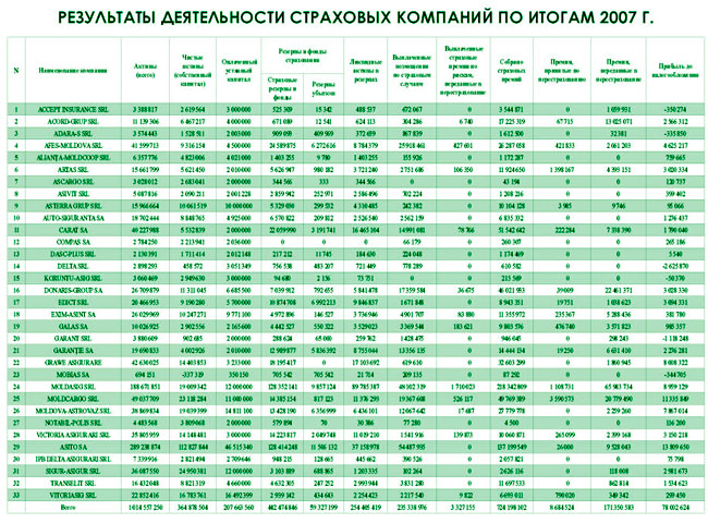 В таблице нет Koruntu Asig из Гагаузии лишь по той причине, что сравнивать было не с чем. Не успев родиться, она умирает. Против нее и еще четырех компаний (Adara S, Asivit, Dasc Plus, Notabil Polis) НКФР инициирована процедура отзыва лицензий. Официальная формулировка – компании не увеличили, в соответствии с законом, уставный капитал до 4 млн. леев. Срок истек 7 апреля 2008 г.