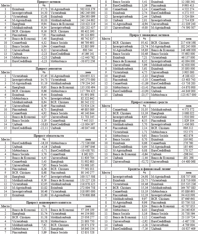 По приросту активов во втором квартале отличились Eximbank (17,7%), Investprivatbank (14,3%), Victoriabank (12,6%), в абсолютном исчислении - M-Agroindbank (+502, 02 млн. леев), Victoriabank (+362,25) и снова - Eximbank (+284,39).