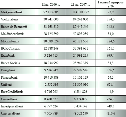 Что бы кто ни говорил, но продажа/покупка денег и услуг, связанных с ними, остается наиболее прибыльным легальным бизнесом в Молдове. В последнее время акционеры все чаше стали задумываться о возврате вложенных средств, поэтому в графе «доход (убыток)» значение цифр с каждым кварталом возрастает. Если к июлю 2006 г. совокупный доход банков составлял 282 млн. леев, то в это же время в 2007 г. цифра почти удвоилась - 517 млн. леев. Единственный, кто остался в минусах во втором квартале, так это Universalbank (-8,3 млн.). И то дело быстрее всего в бухгалтерской ошибке предыдущих отчетов, после чего менеджменту пришлось пересмотреть свое отношение к налоговым органам и формированию доходности.