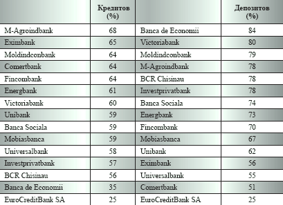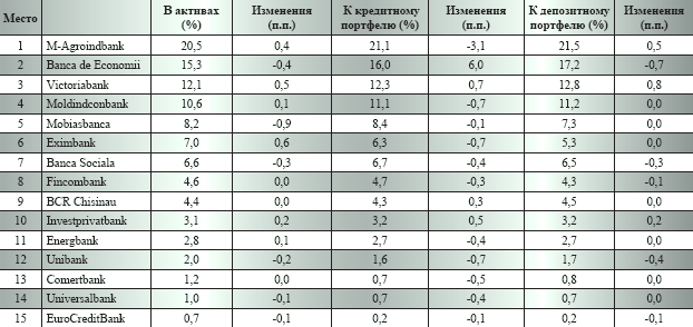 Если долю присутствия на рынке банков оценивать по размеру активов, то 55% рынка приходится на четверку банков - M-Agroindbank, Banca de Economii, Victoriabank, Moldindconbank. У этих же банков 63% депозитов и 60% кредитов. Что касается темпов захвата рынка, то лидером в этом нелегком деле стал Eximbank, прирастивший за квартал 0,6 процентных пункта (п.п.).