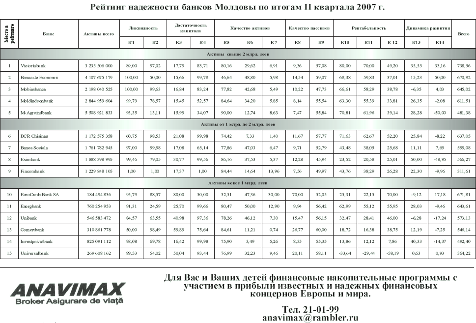 Рейтинг надежности банков Молдовы по итогам II квартала 2007 г.