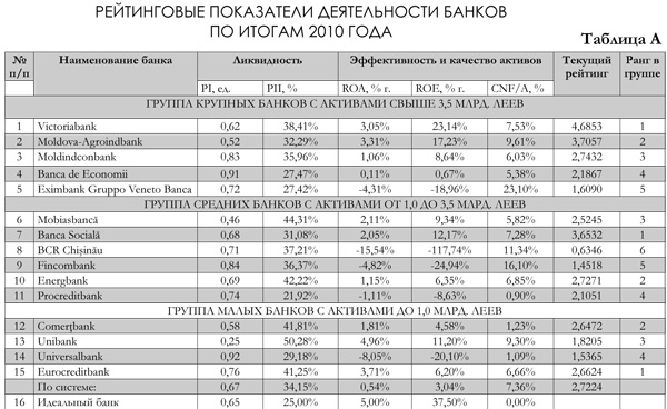 Рейтинг банков, рассчитанный по итогам 2010 г., приведен в таблице А.
