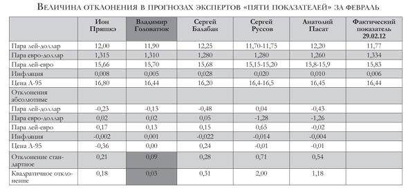 Журнал публикует «пять прогнозов» на конец марта курсов лея к доллару США, евро; соотношение курса евро к доллару; уровня инфляции и стоимости на рынке А-95 марки евро. Приводим соотношение прогнозов экспертов за февраль к реальной инфляции, курсам валют и стоимости бензина. Напоминаем, что эксперта, который на протяжении 2012 г. в своих прогнозах будет ближе всего к реальным показателям, редакция Б&Ф наградит ценным призом.