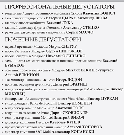 Депутат, экс-министр экономики и торговли Игорь ДОДОН: Хоть я и родился в Кэлэрашском районе – центре молдавского виноделия, профессионалом не являюсь. И все же, по моему мнению, особой похвалы достойно шампанское брют Grand Vintage, хотя Cuvee Prestige в потреблении – легче. Безусловно высокой оценки достоин Cuvee Prestige Rose. Я с удовольствием вспоминаю осень 2007 г., когда это вино было впервые представлено на суд общественности в рамках фестиваля вина. Cricova устроил тогда на центральной площади столицы невероятно красивое шоу, кульминацией которого стал выход девушек, одетых в свадебные платья розового цвета. Неповторимое зрелище! Особой похвалы достойна «Сладкая слеза», совместившая в себе лучший букет, из которых мне удавалось когда-либо попробовать. Что касается вин, господин Бодюл знает мое личное мнение к «Божоле» - это одно из лучших молодых вин, существующих в Европе. Было бы полезно и еще более показательно проводить подобные мероприятия с дегустацией на самом предприятии, тем более что за последние годы там созданы достаточно хорошие условия для этого.