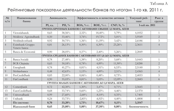 По итогам 1-го квартала 2011 г. абсолютным лидером стал BC Victoriabank S.A. с максимальным значением рейтинга 4,1052. Абсолютным аутсайдером – Unibank - с минимальным рейтингом, равным 1,4808.