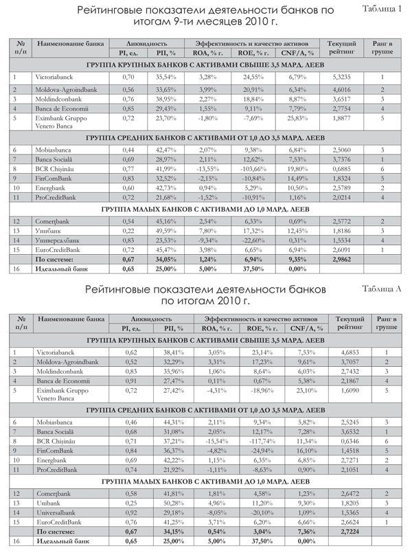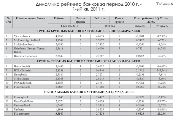 В группе крупных банков сохранил лидерство BC Victoriabank S. A., несмотря на снижение своего значения в рейтинге с 4,6853 в конце 2010 г. до 4,1052. Ухудшение произошло из-за падения показателей рентабельности, оказавшего большее отрицательное влияние, чем положительный эффект от снижения доли неблагоприятных кредитов в активах с 7,53% до 5,79%.