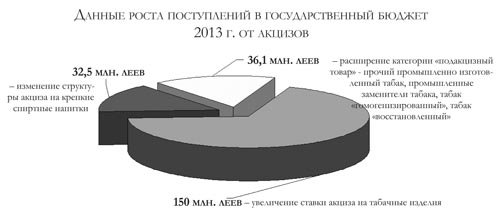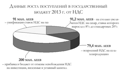 По мнению министра финансов (МФ) Вячеслава Негруцы, изменения в налоговой политике на 2013 г. принесут в бюджет дополнительно 1065,9 млн. леев, или 1,07% ВВП. Из этой суммы 772, 8 млн. леев приходится на изменение ставок по НДС и акцизам. В области НДС способствовать росту бюджетных доходов будут установление стандартной ставки 20% НДС (вместо 8%) на сахар (плюс 91,2 млн. леев) и на сельхозпродукцию в натуральном виде (79,4 млн. леев без учета возврата бюджетом уплаченного сельхозпроизводителями налога - 12%). Унификация ставок НДС на газ дополнительно принесет 91 млн. леев. Отмена освобождения от НДС инвестиций, вносимых в уставный капитал, приведет к росту поступлений НДС на 200 млн. леев. Индексация акцизов, по оценкам МФ, принесет дополнительно 92,6 млн. леев. Изменение структуры акциза на крепкие спиртные напитки принесет в бюджет дополнительно 32,5 млн. леев. Кроме того 150 млн. планируется получить от увеличения ставки акциза на табачные изделия и 36,1 млн. леев – от расширения этой категории подакцизных товаров за счет новой группы – «Прочий промышленно изготовленный табак и промышленные заменители табака; табак «гомогенизированный» или «восстановленный»».