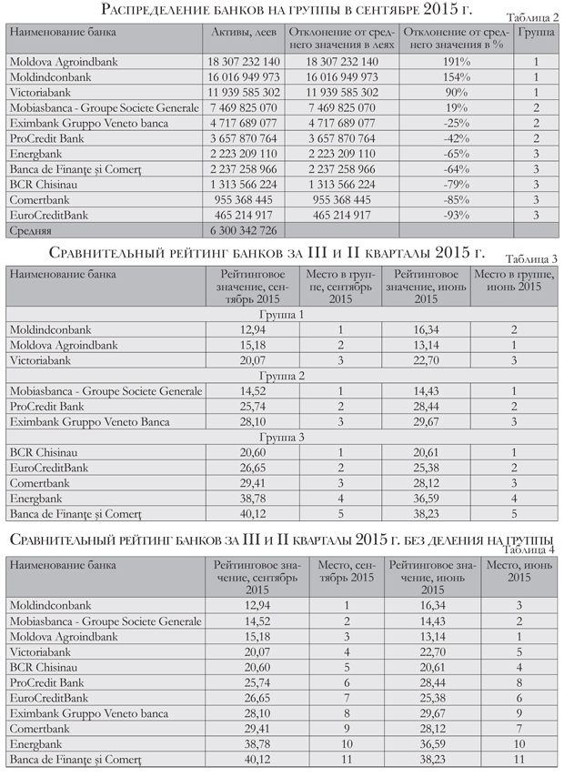 Рассматривая рейтинг банков за II и III кварталы 2015 г., мы отмечаем, что в позиции банков из первой группы (с активами более чем 50% от средней величины активов по банковской системе) произошла рокировка: если во II квартале на первом месте фигурировал BC Moldova Agroindbank S.A. (MAIB), на втором месте – BC Moldindconbank S.A. (MICB), то по результатам третьего квартала MICB выходит на первое место, оставляя на втором месте MAIB. Третье место в первой группе стабильно удерживает BC Victoriabank S.A.