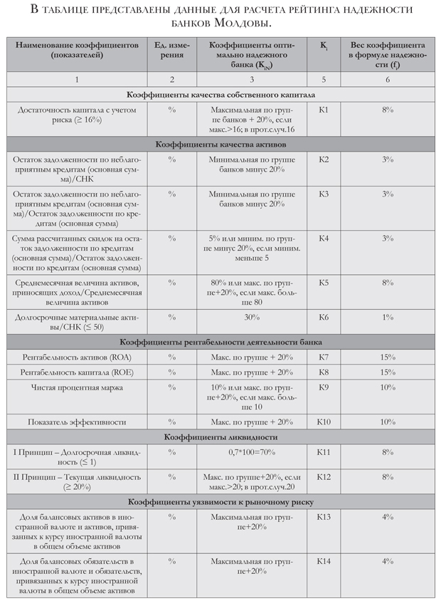 Для построения текущего индекса надежности коэффициенты каждого банка сопоставляются с соответствующими коэффициентами некоего гипотетического банка, называемого оптимально надежным, «идеальным». Под оптимально надежным понимается банк, надежный достаточно, но не чрезмерно, имеющий разумное распределение активов и пассивов, в том числе «разумную долю» работающих активов. То есть оптимально надежный банк для достижения доходности поддерживает разумное соотношение между безопасностью операций и стремлением к доходности (допущением риска). Коэффициенты оптимально надежного банка представлены в графе 3 Таблицы 1.