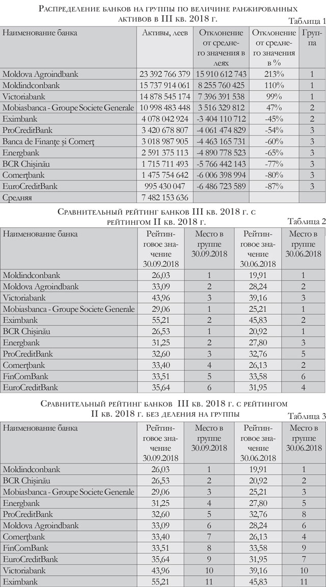 Редакция журнала Б&Ф по собственной методике рассчитывает рейтинг молдавских банков, тесным образом привязанный к результатам их деятельности. В ноябрьском номере представляем рейтинг банков по результатам их деятельности за третий квартал, сравнивая рейтинговые значения с аналогичными показателями по итогам второго квартала 2018 г.
