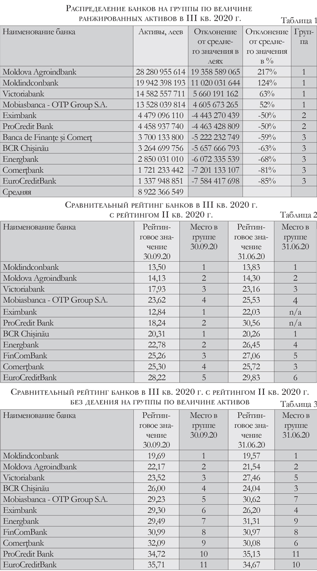 Как видно из табл. 2, в первой группе банков, с отклонением активов от среднего значения более чем на 50%, в сравнении со II кварталом никаких изменений не происходит. Moldindconbank, Moldova Agroindbank, Victoriabank и Mobiasbanca занимают, соответственно, с первой по четвертую строку в группе.