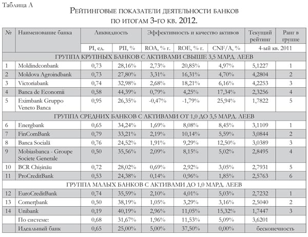 Рейтинг банков, рассчитанный по итогам III квартала 2012 г., приведен в таблице «А».