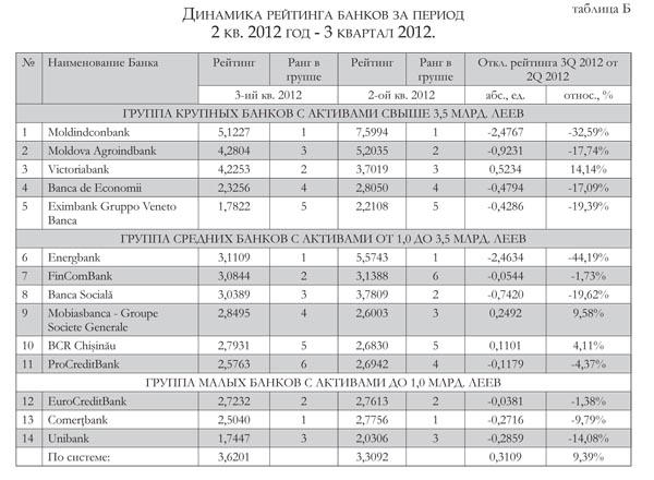 В третьем квартале рейтинг почти всех банков из этой группы (за исключением BC «Mobiasbanca - Groupe Societe Generale» S.A. и BCR Chişinău S.A.) снизился в сравнении со вторым кварталом 2012 г.