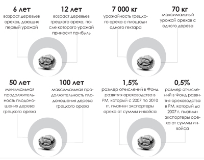 Если говорить о доходах, то, в зависимости от урожайности, с одного гектара можно собрать 5-7 тонн орехов. Если продать их в Молдове в скорлупе, то орех будет стоить примерно 1,5-2 евро за килограмм. Получается, что на доходы с одного гектара орехового сада семья может спокойно прожить год, вкладывая при этом часть денег в открытие сопутствующих развитию этого бизнеса производств.