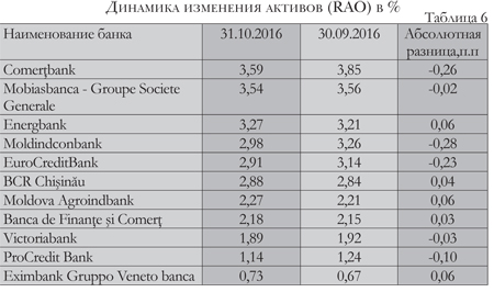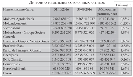 • Объем совокупных активов банковской системы в октябре 2016 г. вырос незначительно – на 0,64% (+462,0 млн. леев) по сравнению с сентябрем 2016 г. Более других выросли активы Comerţbank-а (+6,54%). Более других снизились активы ВCR Chişinău (-3,26%).