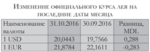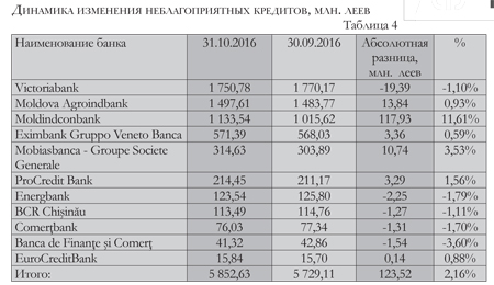 Значительно выросли остатки по кредитам, предоставленным учреждениям, финансируемым из государственного бюджета (+82 млн. леев). Кредитный портфель в иностранной валюте уменьшился на 64 млн. в леевом эквиваленте. Крупные изменения коснулись кредитов сельскохозяйственной отрасли (минус 25 млн. в леевом эквиваленте), небанковского финансового сектора (минус 45 млн. в леевом эквиваленте). Почти на 105 млн. в леевом эквиваленте выросли остатки на ссудных счетах торговли. Портфель неблагоприятных кредитов пополнился в октябре еще на 14 млн. леев и составил 1,5 млрд. леев.