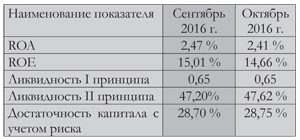 • Незначительно меняются значения показателей рентабельности активов (ROA) и капитала (ROE), ликвидности II принципа и достаточности капитала по системе в октябре. Лишь ликвидность I принципа остается в октябре неизменной на уровне сентября – 0,65%. Динамика этих показателей за два месяца представлена в таблице: