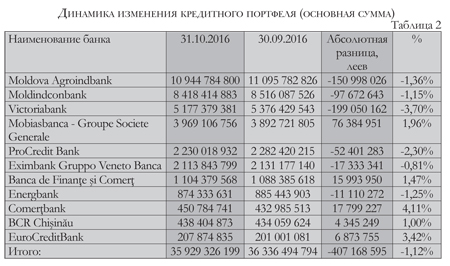 • Величина изменения агрегированного кредитного портфеля системы - минус 1,10% указывает на его незначительное снижение в октябре по сравнению с сентябрем. В абсолютных величинах суммарный кредитный портфель снизился на 407,2 млн. леев. Самую высокую положительную динамику портфеля кредитов +4,11% продемонстрировал Comerţbank. Самое существенное сокращение кредитного портфеля – минус 3,70% – произошло в Victoriabank-е.