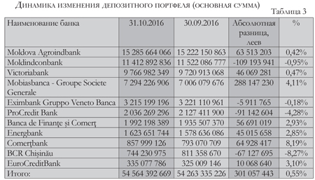 Рост депозитного портфеля почти на 65 млн. леев происходил как за счет увеличения леевых остатков (+17 млн. леев), так и за счет роста остатков в иностранной валюте (+48 млн. в леевом эквиваленте). Активно привлекались средства от физических лиц в национальной валюте и размещались в виде срочных процентных депозитов (+24 млн. леев). На 6 млн. леев пополнились срочные процентные депозиты юридических лиц. Однако с текущих счетов в национальной валюте юридических лиц в октябре уходит почти 12 млн. леев. Рост портфеля в иностранной валюте происходит за счет пополнения остатков на беспроцентных депозитах до востребования юридических лиц (+47 млн. в леевом эквиваленте). Также за счет привлечения средств от физических лиц пополняются срочные беспроцентные счета (+2,9 млн. в леевом эквиваленте).