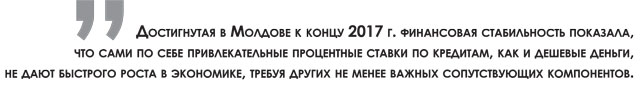 Достигнутая к концу 2017 г. финансовая стабильность показала, что сами по себе привлекательные процентные ставки по кредитам не дают в одночасье завидного роста в экономике. Для этого необходимы еще многие сопутствующие компоненты, к примеру, деловая среда, бизнес-проекты, способные обеспечить той или иной отрасли прорыв, инвестиционная привлекательность, рынки сбыта, предсказуемая экономическая политика и, не в последнюю очередь, политическая стабильность.