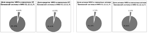 С первого и поверхностного взгляда, в 2012 г. МФО продолжали занимать скромную позицию на рынке кредитов. По сравнению с 2011 г., доля активов МФО в совокупных активах банковской системы снизилась, так же как и доля выданных кредитов, что наглядно подтверждают диаграммы.