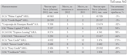 Гораздо больше изменений произошло за год по показателю чистой прибыли. Несмотря на небольшое снижение показателей, лидеры остались прежними. Их доля в совокупном объеме прибыли всех МФО составляет 71,7%. Это - I.C.S. ”Prime Capital» S.R.L. и I.C.S. «Credit Rapid» S.R.L. В первую десятку ворвался I.C.S. «Iute Credit» S.R.L., увеличив за год прибыль на 173%. Наибольшие изменения коснулись МФО, занимавших в прошлом году позиции с 3 по 7 места, что видно в таблице №2.