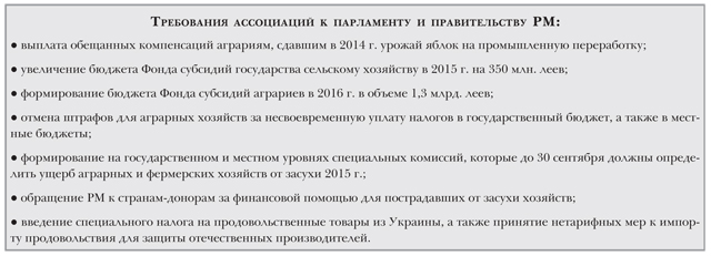 А.С.: Пожалуй, единственное конкретное действие властей заключалось в секретных постановлениях двух правительств, решивших выдать НБМ гарантию государства на выдачу проблемным банкам 15 млрд. леев, которые теперь придется возвращать за счет всех налогоплательщиков. Нам нужно протестовать, чтобы таким образом заставить правительство обратить внимание на проблемы сельского хозяйства. Властям РМ стоило бы поучиться опыту у правительств Польши и Чехии в плане поддержки аграриев в условиях кризиса в связи с эмбарго России.