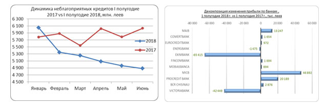 В разрезе видов заемщиков сокращение обусловлено сжатием корпоративного кредитования (минус 2,6 млрд. леев) до уровня 24,5 млрд. леев. В то же время был зафиксирован скачок розничного кредитования (+1,5 млрд. леев), а его объем достиг к концу первого полугодия 2018 г. 8,6 млрд. леев. При этом консолидированный портфель кредитов в евро упал на эквивалент 1 млрд. леев, долларовый портфель потерял эквивалент $0,5 млрд., а портфель в молдавских леях, напротив, вырос на 0,5 млрд. леев. Существенно, на 1,2 млрд. леев (минус 19,1%), снизился объем неблагоприятных кредитов (субстандартные, плюс сомнительные, плюс безнадежные).