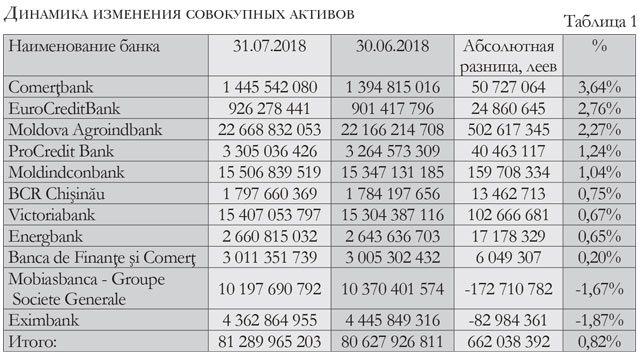 Сравнивая в динамике совокупные активы банковского сектора на конец июня и июля 2018 г., можно констатировать их очевидный рост по действующим банкам на 0,8% - с 80,6 млрд. леев до 81,3 млрд. леев. В абсолютном выражении увеличение составило 0,7 млрд. леев. Большая часть этой суммы (76%, или 0,5 млрд. леев) относится к Moldova Agroindbank - одному из главных игроков финансового рынка Молдовы, доля которого 27,9% от общего объема активов по банковской системе.