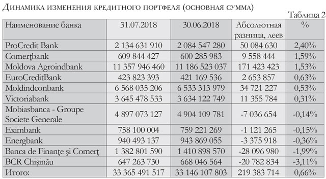 В июле 2018 г. продолжается рост кредитования, но происходит смещение в сторону иностранной валюты. Портфель в евро увеличивается на 2,5 млн. в эквиваленте в леях, в долларах США – на 1,9 млн. в эквиваленте в леях (с учетом давления отрицательной курсовой разницы). В результате крупных погашений кредитов в национальной валюте, а именно - в секторе торговли (минус 5,2 млн. леев) и в секторе небанковских финансовых организаций (минус 1 млн. леев), совокупный портфель в леях уменьшается на 1,7 млн. леев. Тем не менее продолжается кредитование в леях экономических агентов, работающих в области транспорта, телекоммуникаций и развития сети (+3,4 млн. леев) и в секторе оказания услуг (+0,9 млн. леев).