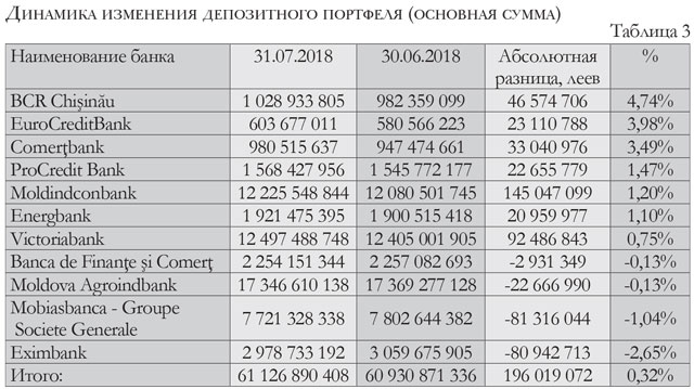 Портфель неблагоприятных кредитов снижается на 1,68 млн. леев. Их доля в портфеле составляет в июле 2018 г. 12,13%. Увеличение депозитного портфеля на 46,6 млн. леев происходит за счет его валютной части (+55,8 млн. в эквиваленте в леях). На 7,8 млн. в эквиваленте в леях пополняют счета физические лица, из которых 7,0 млн. в эквиваленте в леях приходятся на срочные размещения. Вклад экономических агентов составляет 48 млн. в эквиваленте в леях, в том числе 15,8 млн. в эквиваленте в леях принадлежат банкам. Виновниками сжатия депозитного портфеля в национальной валюте на 9,2 млн. леев становятся юридические лица, уменьшившие остатки на своих счетах на 22,4 млн. леев.
